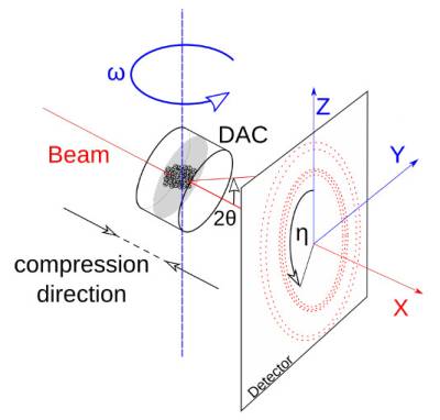 Let's assume our sample is rotated from ω1 = -20° to ω2 = +20° during the acquisition. When you reach extreme ω values you can see a shadow on one side of the diffraction images. These shadows originate from the DAC which has a limited opening angle on the outside. The further you rotate, the less 2θ angles are visible.