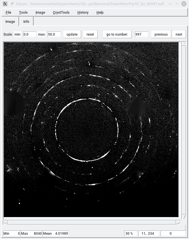 - apply a median filter on the reduced image to clear out small diffraction spots, which are probably originating from the sample,
