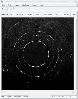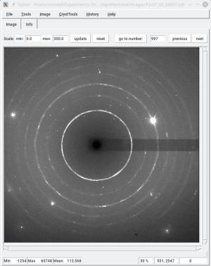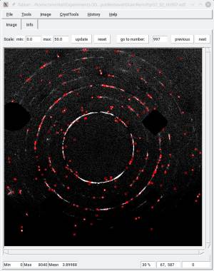As a test, the image below shows the sample peaks we extracted from the final image. This would not have been possible on the raw diffraction image.
